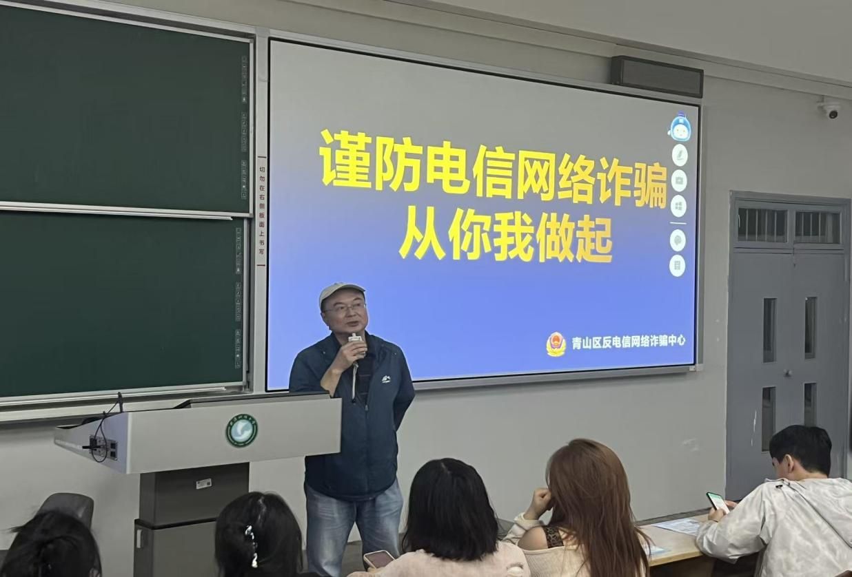本网讯(通讯员蒋开胜 杨雍慧)为切实增强在校师生的防范电信网络诈骗意识,提升自我保护能力,营造安全、和谐、无诈的校园环境,9月23日,学校保卫处联合武汉市公安局青山分局政保大队、反诈中心在青山校区主楼0102教室举办“全民反诈 · 关乎你我”专题讲座。本次活动特邀青山分局反诈中心负责人黄道员警官担任主讲,通过真实案例剖析与防范技巧讲解,为广大师生带来了一堂生动而深刻的反诈教育课。学校材料学部、机械工程学院、冶金与能源学院、电子信息学院、资源与环境工程学院、化学与化工学院,人工智能与自动化学院各级学生代表共计220余人参加本次讲座。