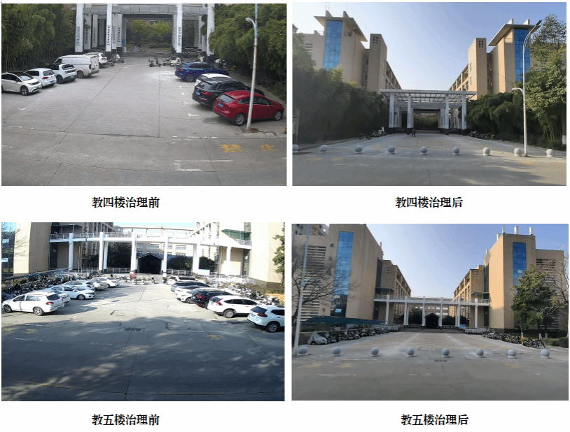 治理前,该区域人车混行、车辆乱停乱放现象较为突出,存在一定安全隐患。经过系统整顿,目前教学楼前已增设醒目交通标识与隔离设施,划定非机动车专用停放区,并增派安保人员定时巡查。如今,行人通道畅通无阻,非机动车摆放整齐有序,师生出行安全得到切实保障,校园环境更加整洁,教学区整体运行效率与文明形象显著提升。