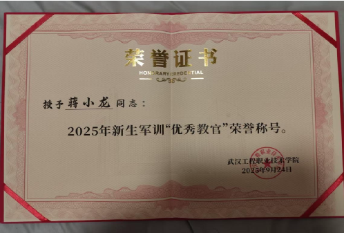 本网讯(通讯员黄世军) 近日,武汉工程职业技术学院2025年新生军训工作任务圆满落幕。根据青山区人武部抽调人员参加学生军训通知要求,我处选派在编民兵蒋小龙以军训教官身份参与此次为期14天的新生军训工作。他以高度的责任担当、过硬的军事素质和出色的组织能力,高质量完成了军训任务,赢得所在学校、青山区人武部领导和全体参训师生的高度赞誉和广泛好评。个人被评为新生军训“优秀教官”。