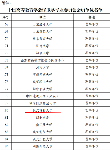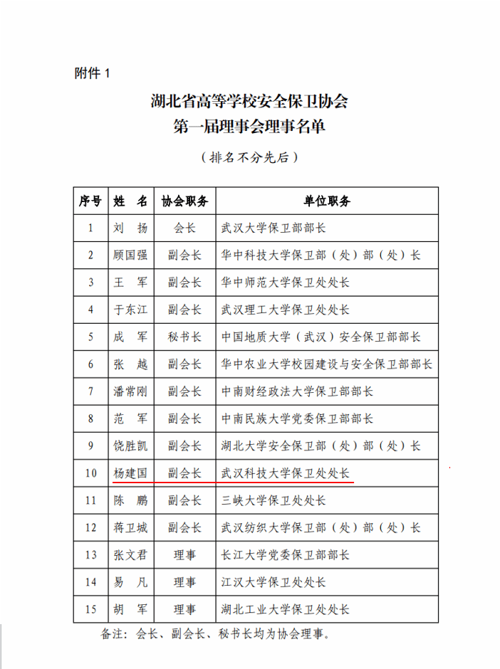 本网讯(通讯员黄世军)近日,中国高等教育学会保卫学专业委员会与湖北省高等学校安全保卫协会分别公布了新一届理事会及监事会名单。根据相关通知,我校同时入选两个重要安全保卫组织的领导机构,分别当选为中国高等教育学会保卫学专业委员会第八届理事会理事单位,以及湖北省高等学校安全保卫协会第一届理事会副会长单位。