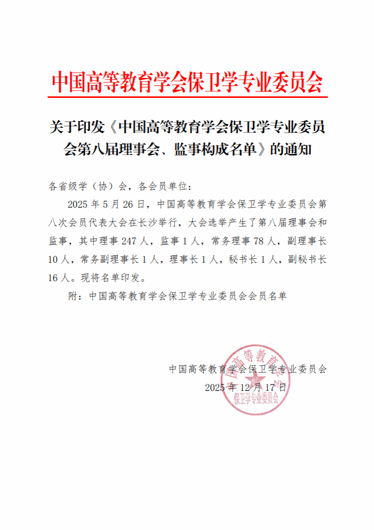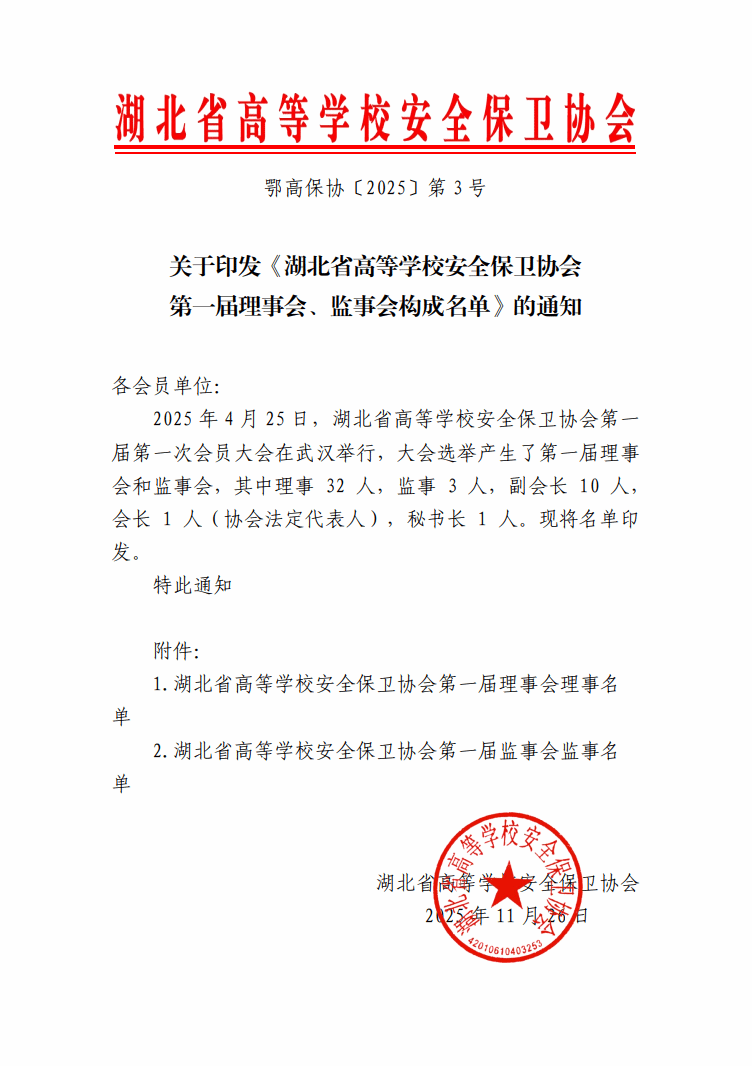 据了解,2025年5月6日,中国高等教育学会保卫学专业委员会第八次会员代表大会在长沙召开。会议选举产生第八届理事会和监事,包括理事247人、监事1人,并推选出常务理事78人、副理事长10人、常务副理事长1人、理事长1人、秘书长1人及副秘书长16人。此前,湖北省高等学校安全保卫协会于2025年4月25日在武汉召开第一届第一次会员大会,选举产生第一届理事会和监事会,其中理事32人、监事3人,并选举出副会长10人、会长(法定代表人)1人、秘书长1人。